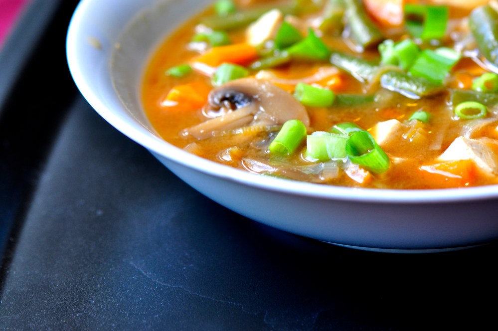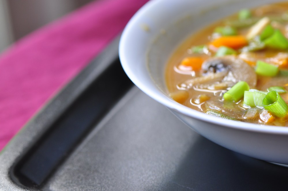 Add button mushrooms and leek to your broth, bringing it to a boil. Cover it up again and reduce heat, and let it simmer for another 5 minutes. Add in the sweet potato and green beans and simmer for another 7 minutes or so until you can easily stab a fork into the sweet potato.