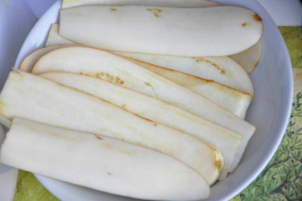 - 1 large white eggplant, sliced length-wise in thin strips