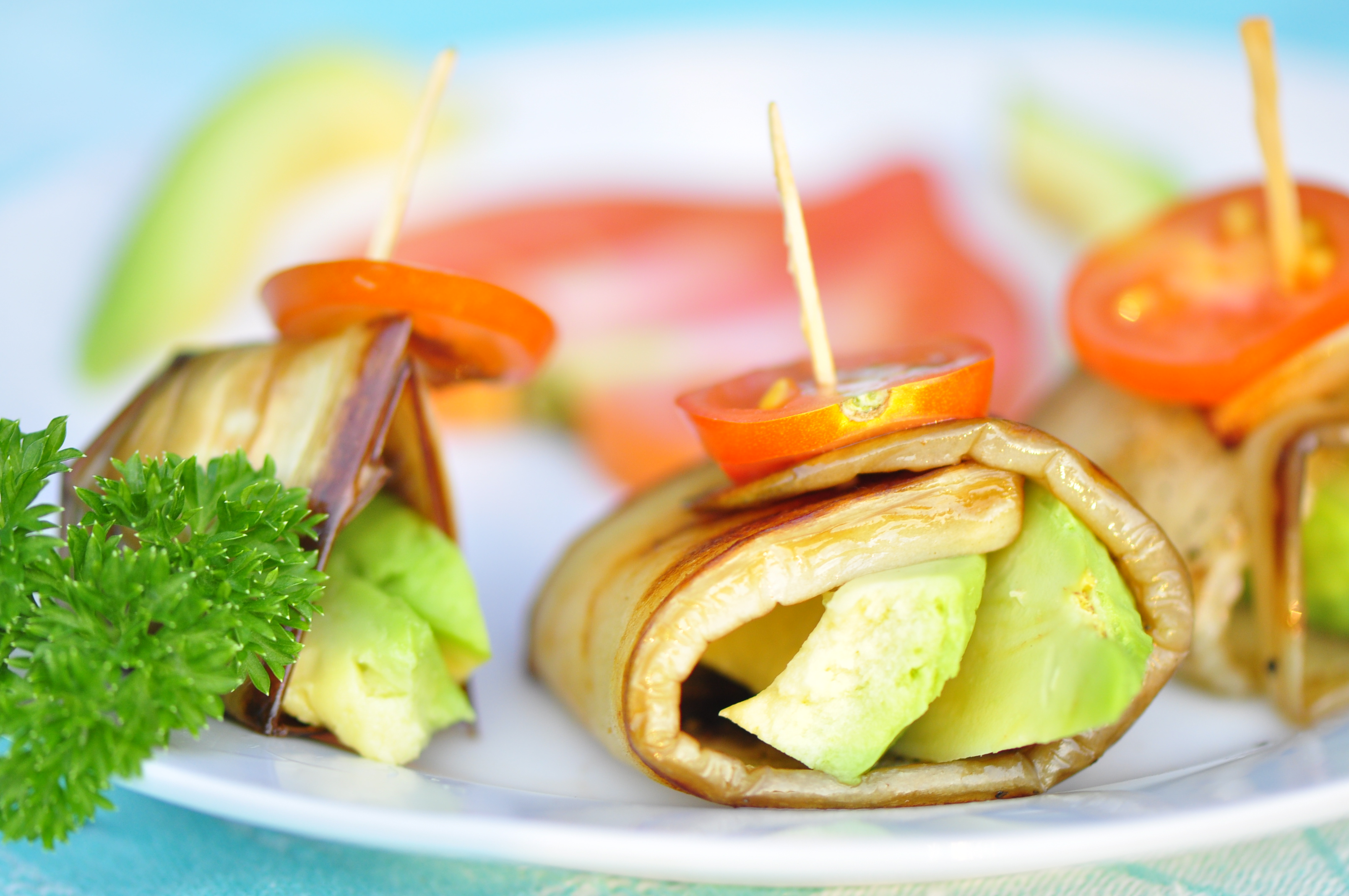 Once the eggplant is cool enough, place the avocado slices in the middle and roll both ends upwards (view photo for reference). Keep your finger on the middle fold and stick a toothpick down the center to keep everything in place. Add 1 slice of cherry tomato on top of the toothpick. I garnished mine with parsley and some larger slices of tomato just to add to the plate.
