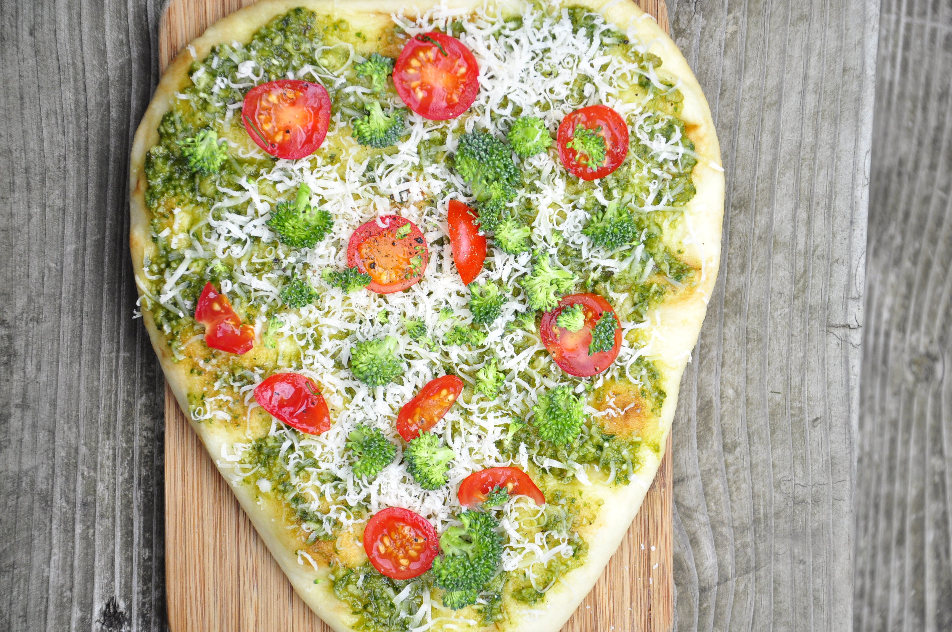 Place tomatoes and broccoli evenly on the naan. Add pepper, if desired. Bake directly on the rack for 7-10 minutes until edges begin to look light brown.