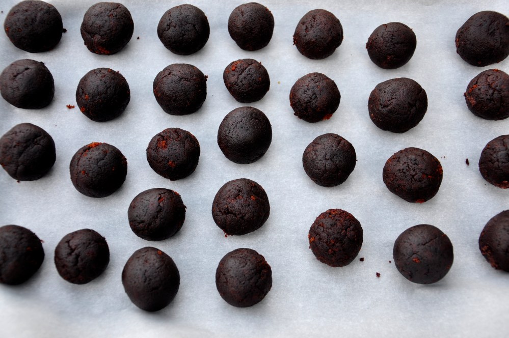 Roll mixture into “quarter-sized” balls, placing carefully on cookie sheet coated in wax paper.