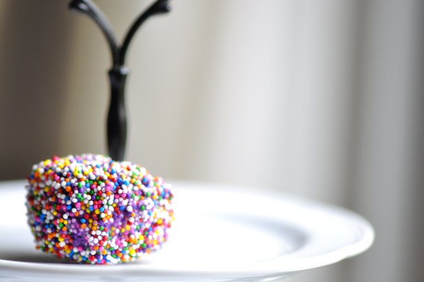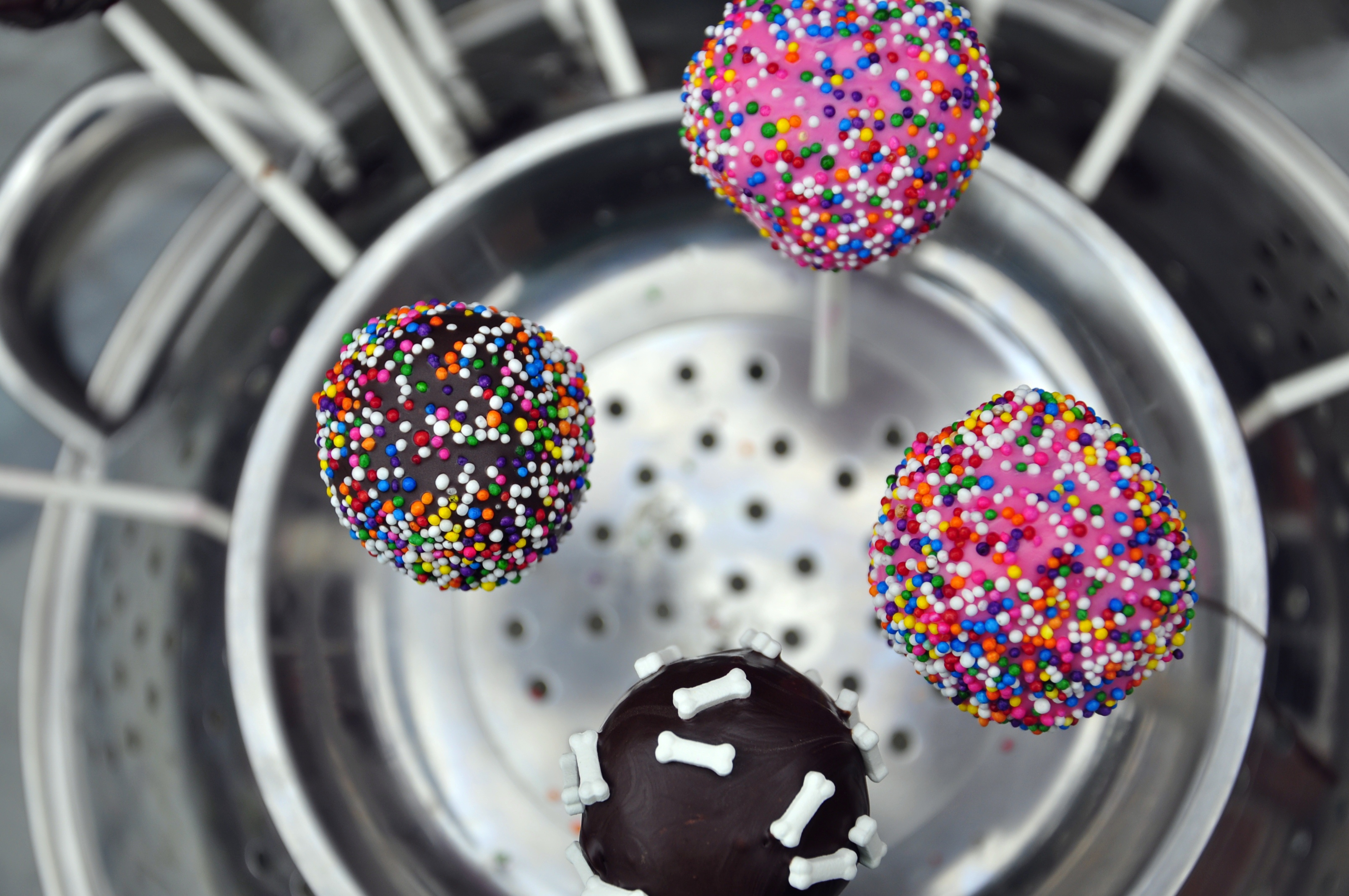 Place cake pops either in a stand, styrofoam block or cullender turned upside down. If you want sprinkles, it’s best to have a bowl beside your dipping bowl so you can roll the pops in it directly, or just sprinkle on top for a light cover.