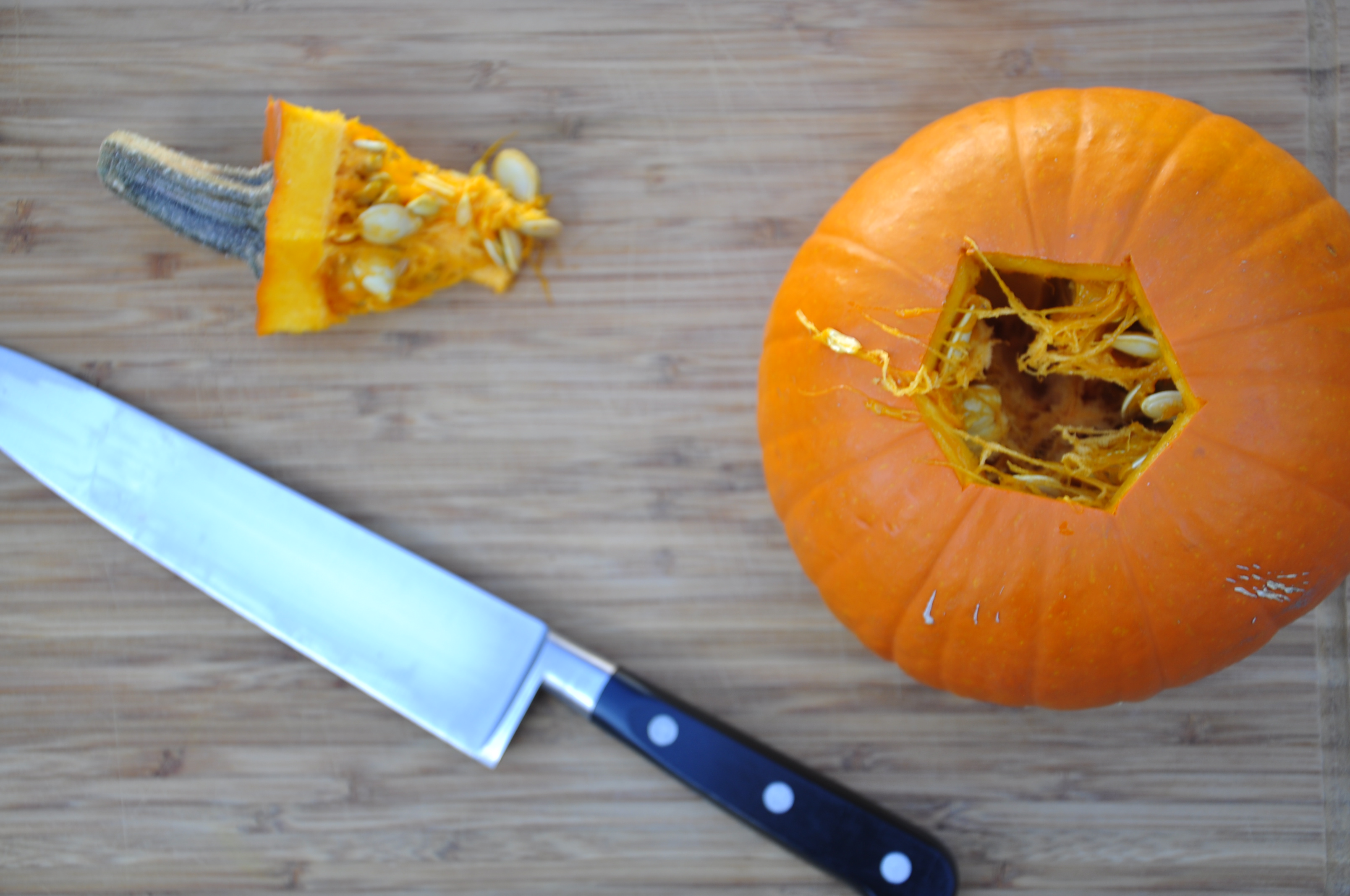 With a large sharp knife, cut around the stem of the pumpkin to remove it (as if you were going to make a jack-o-lantern).