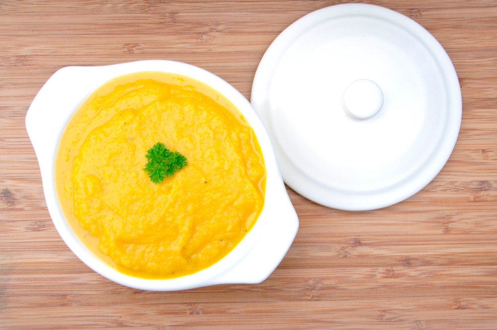 In a medium-sized saucepan, heat remaining olive oil. Add onion and garlic and saute until just starting to look golden. Add the butternut squash, broth, a pinch more of black pepper and hot sauce (if you want it). Let the soup simmer for roughly 5 minutes, stirring once or twice to make sure everything is well mixed.