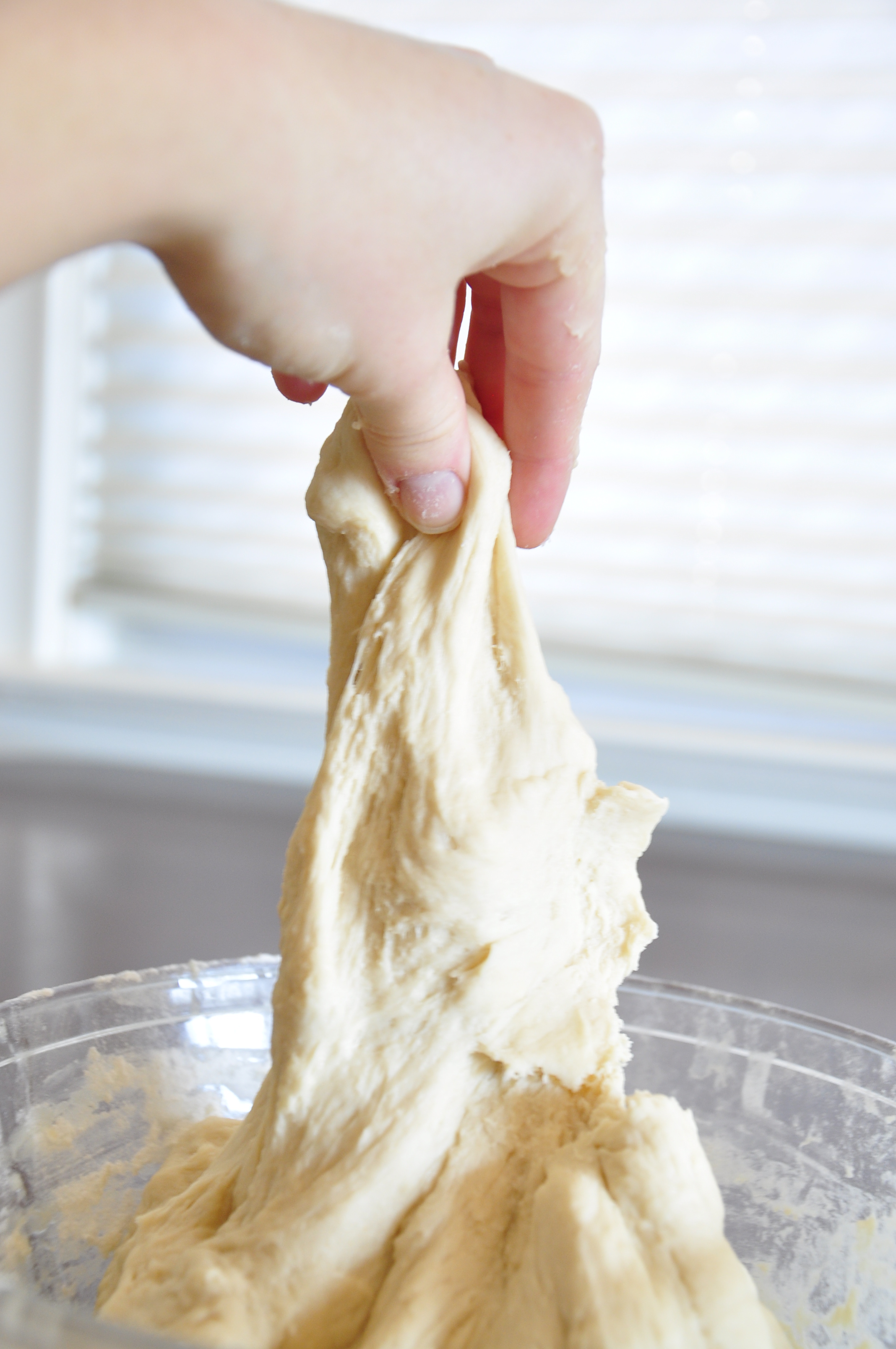 Add the butter and sugar. Gradually add the flour, and then add salt. Knead the dough for about 10 minutes, until the dough firms up and is all well mixed. Place the dough in a greased bowl, and cover with greased clingwrap. Let the dough rise for roughly one hour in a warm place. The dough should double its size.