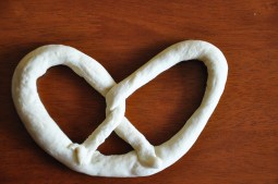 “Punch down” dough and divide it into twelve even lumps. Roll them out as thin as you can without ripping them. Combine the warm water and baking soda in a bowl. Form dough into pretzel shapes (see photos) and dip in baking soda water. Place pretzels on a greased baking sheet, and sprinkle with coarse salt.