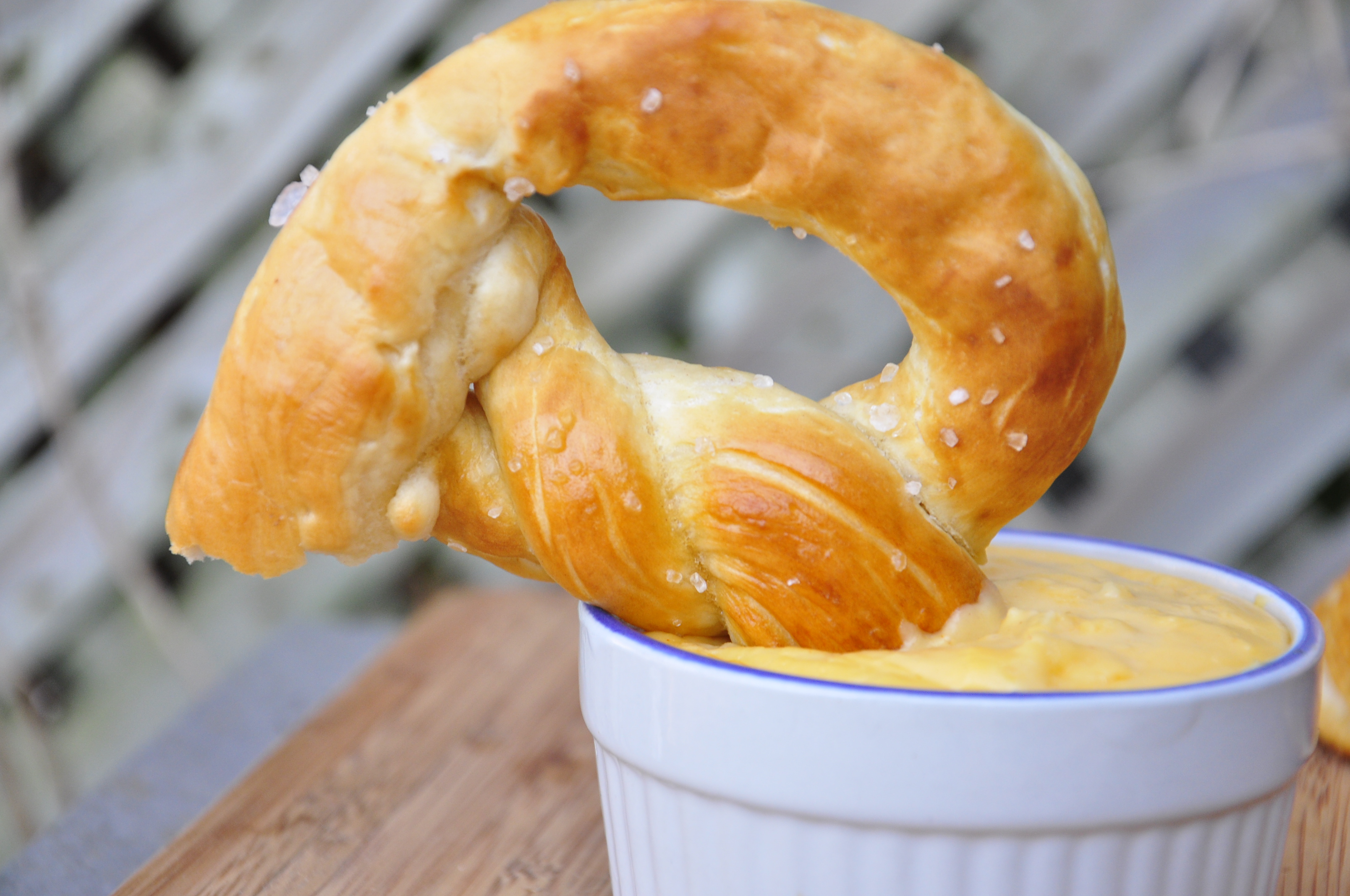 I made these pretzels back in the summer and they were a big, big hit. You can eat them on their own, with spicy jalapeno mustard or with garlic cheese sauce, which is what I made this time.