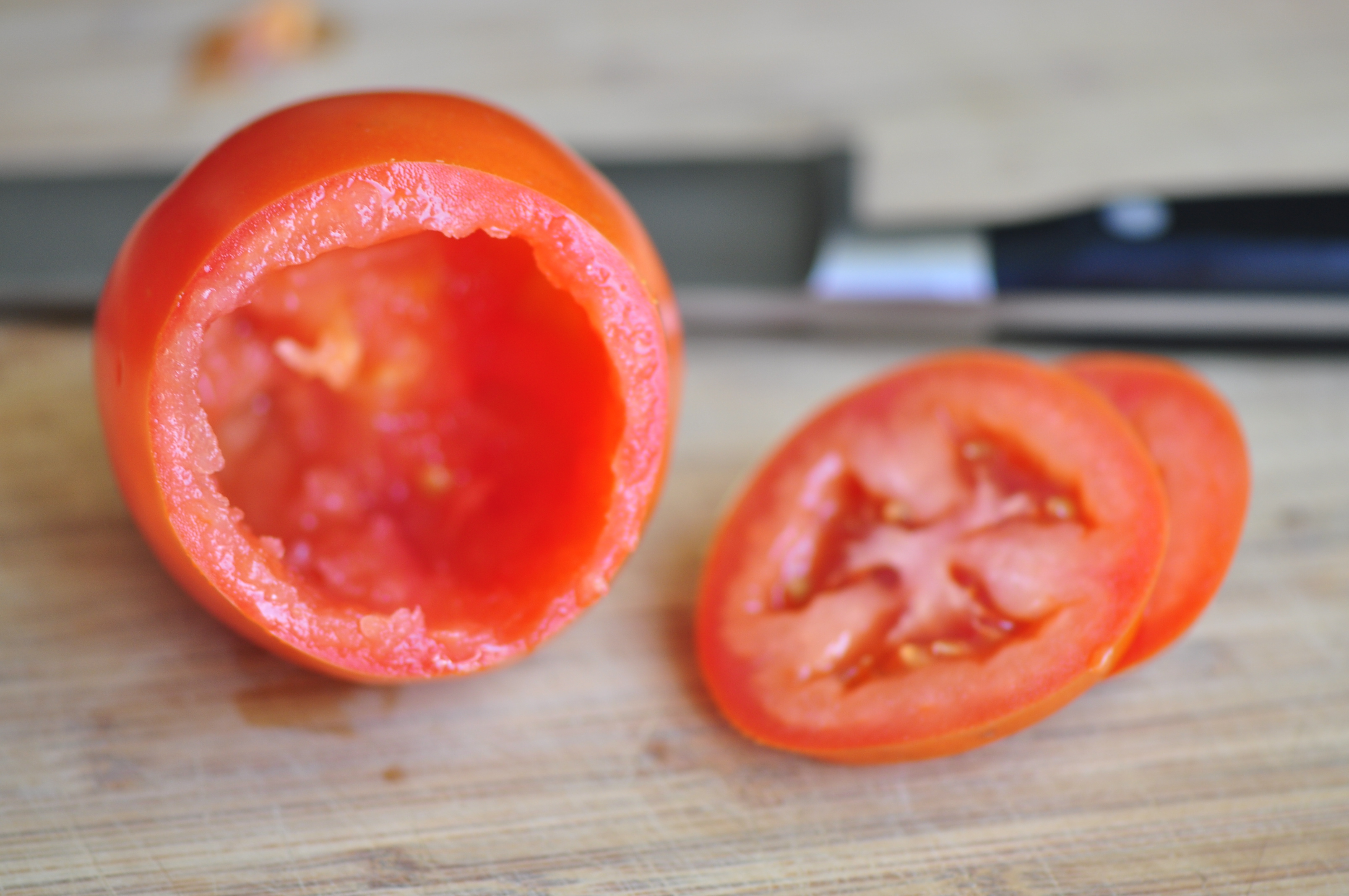 Cut the top off tomato and scoop out the insides so it’s hollow. You may have to cut a very small amount off the bottom of the tomato just so it doesn’t tip over, but only do this if necessary so liquid won’t leak out.