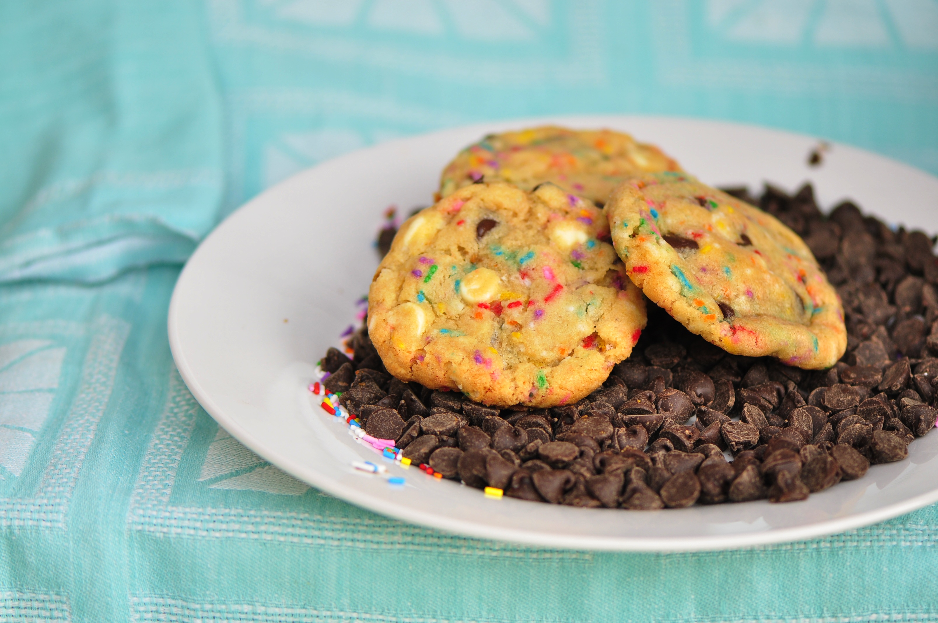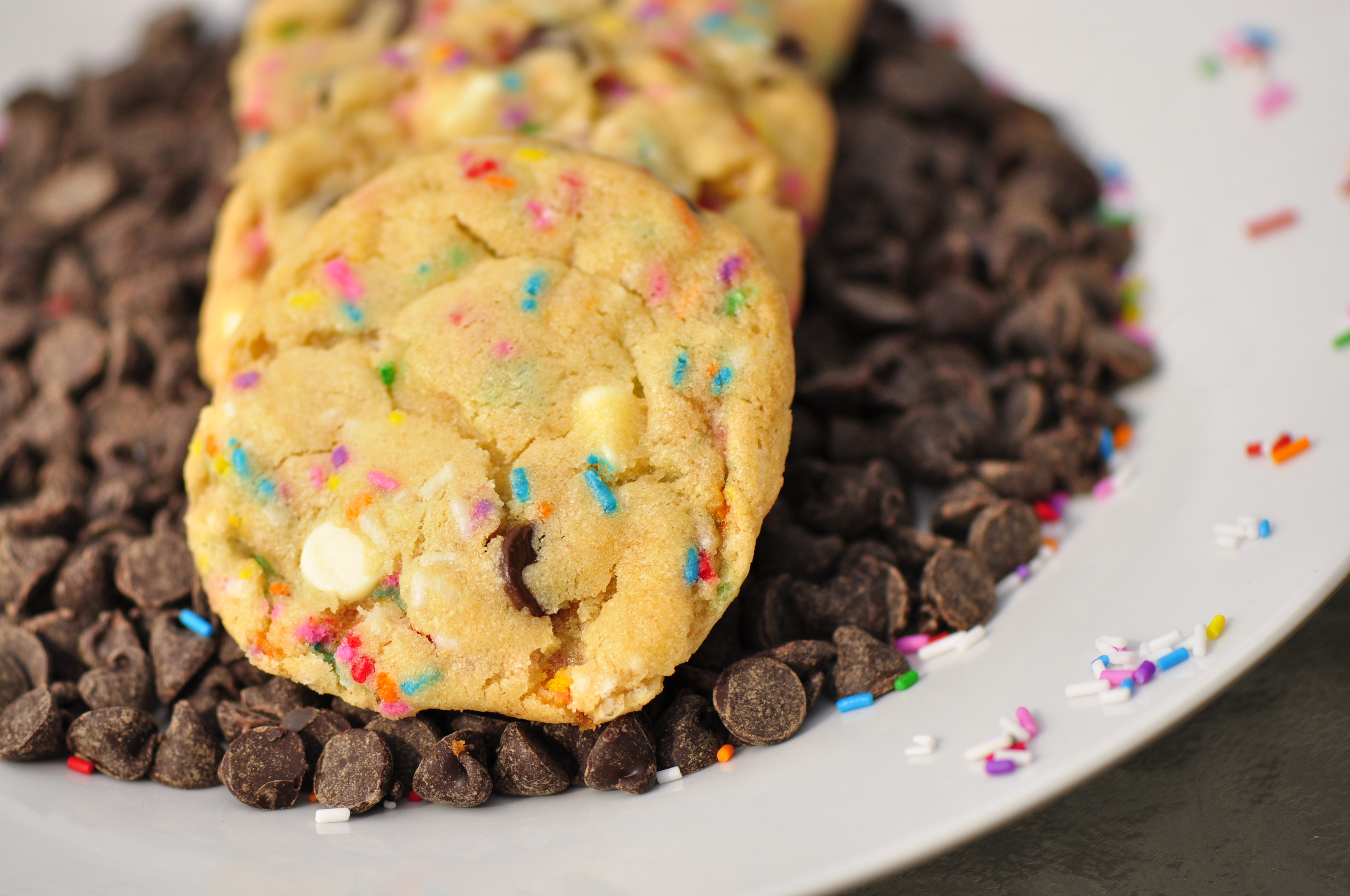 Add flour mixture into the wet ingredients, and mix until just combined. I found it was easier to do this with a wooden spoon (or your hands, if you don’t mind the mess) just because the batter was getting all clumped up in my mixer. Fold in the chocolate chips and sprinkles.