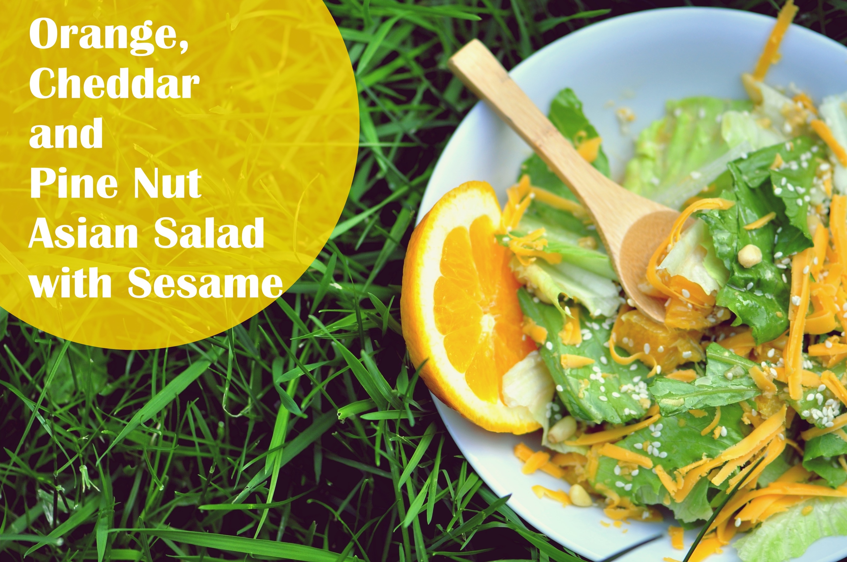 Combine lettuce, orange, cheddar and pine nuts in a salad bowl. In a separate smaller bowl for the dressing, whisk together sesame and vegetable oil, hot sauce, soy sauce and orange juice. Drizzle the dressing over the salad mix and sprinkle sesame seeds on top.