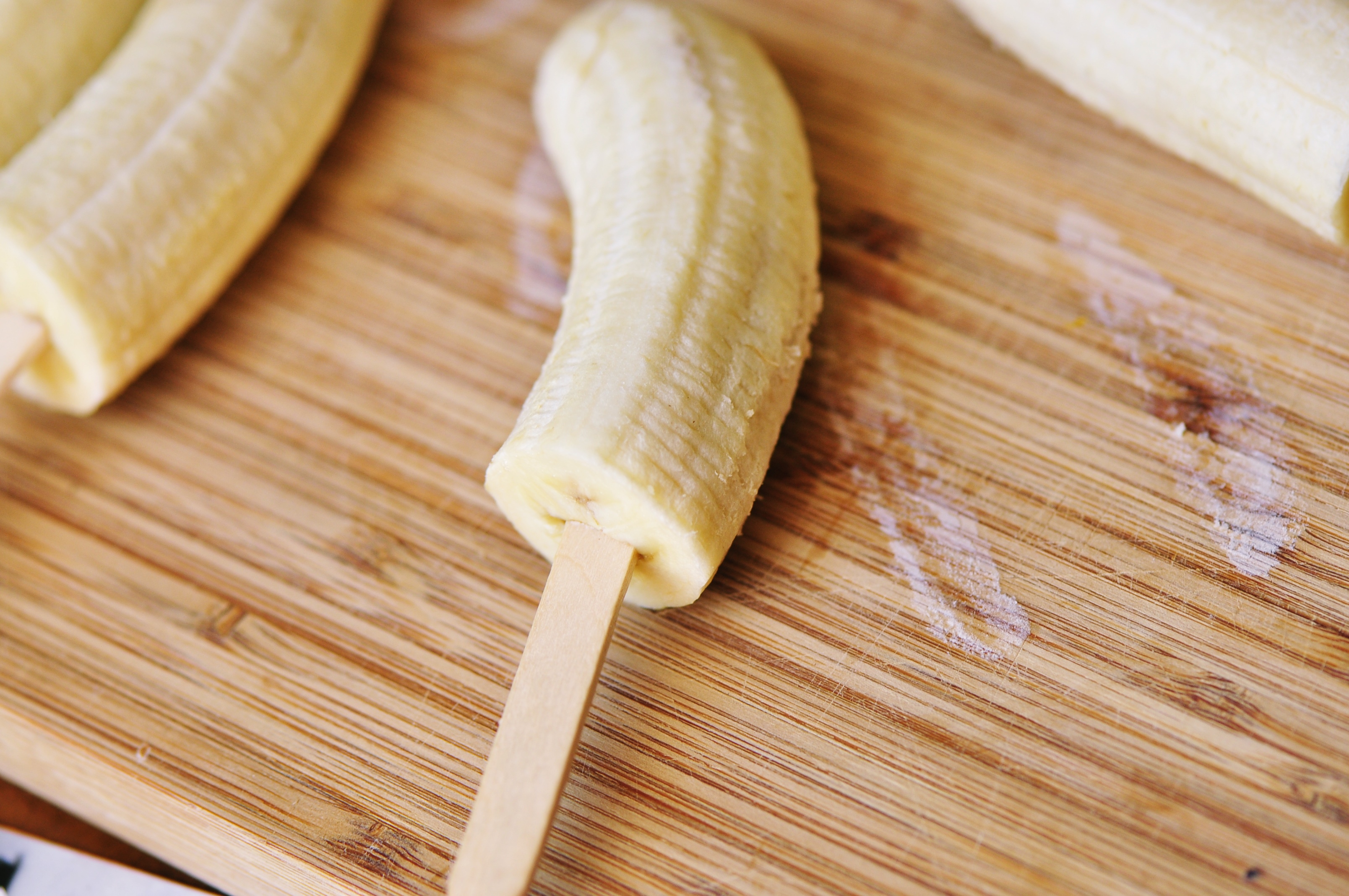 Cut each banana in half, and insert popsicle sticks into bottoms of each half. Freeze bananas for 1 hour until solid. Frozen Banana Halved