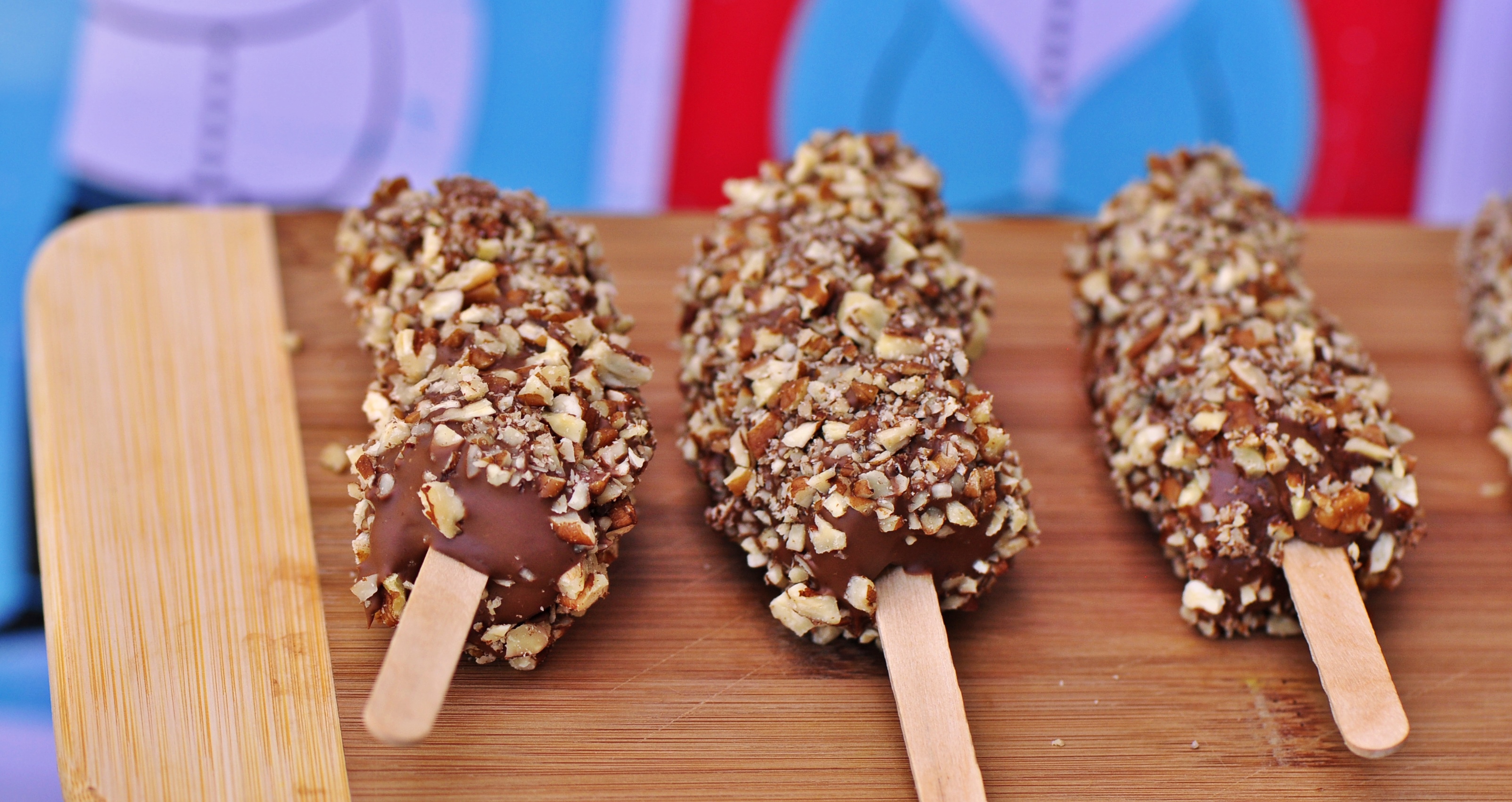 Dip the frozen bananas in chocolate so they are completely coated, then generously roll in chopped nuts. Serve immediately or re-freeze for a few hours later.