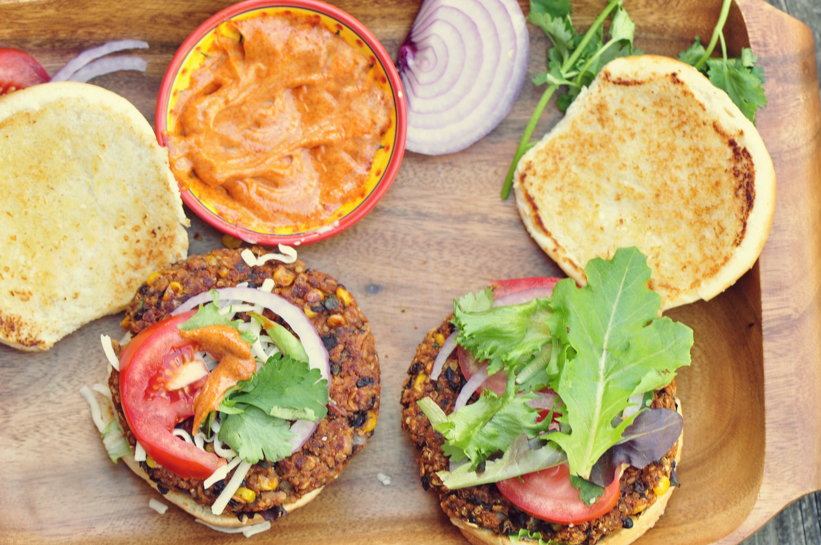Vegetarian burgers made with chipotle peppers in adobo, corn, black beans, veggies, oats and spices. Gluten-free friendly as well.