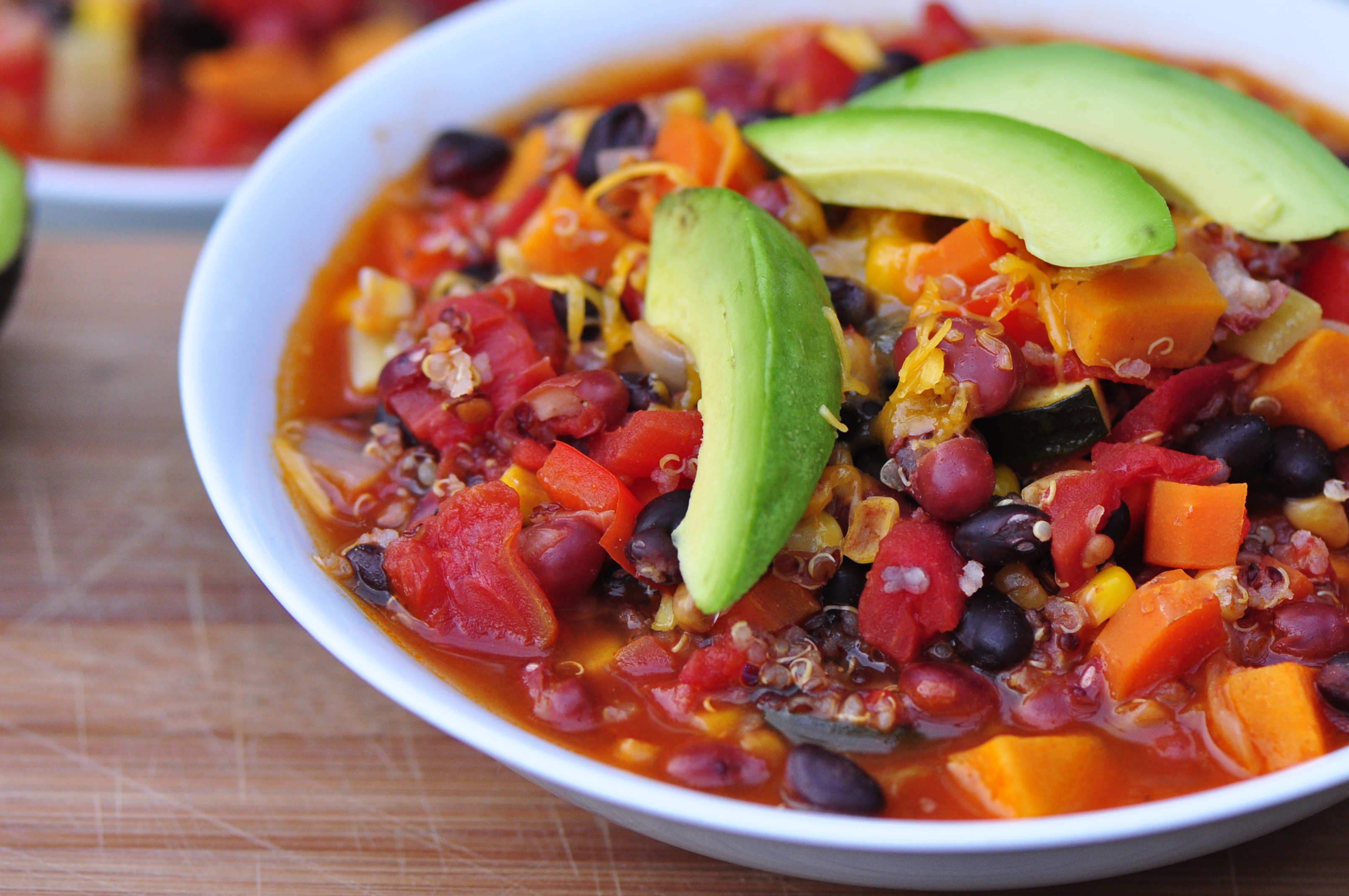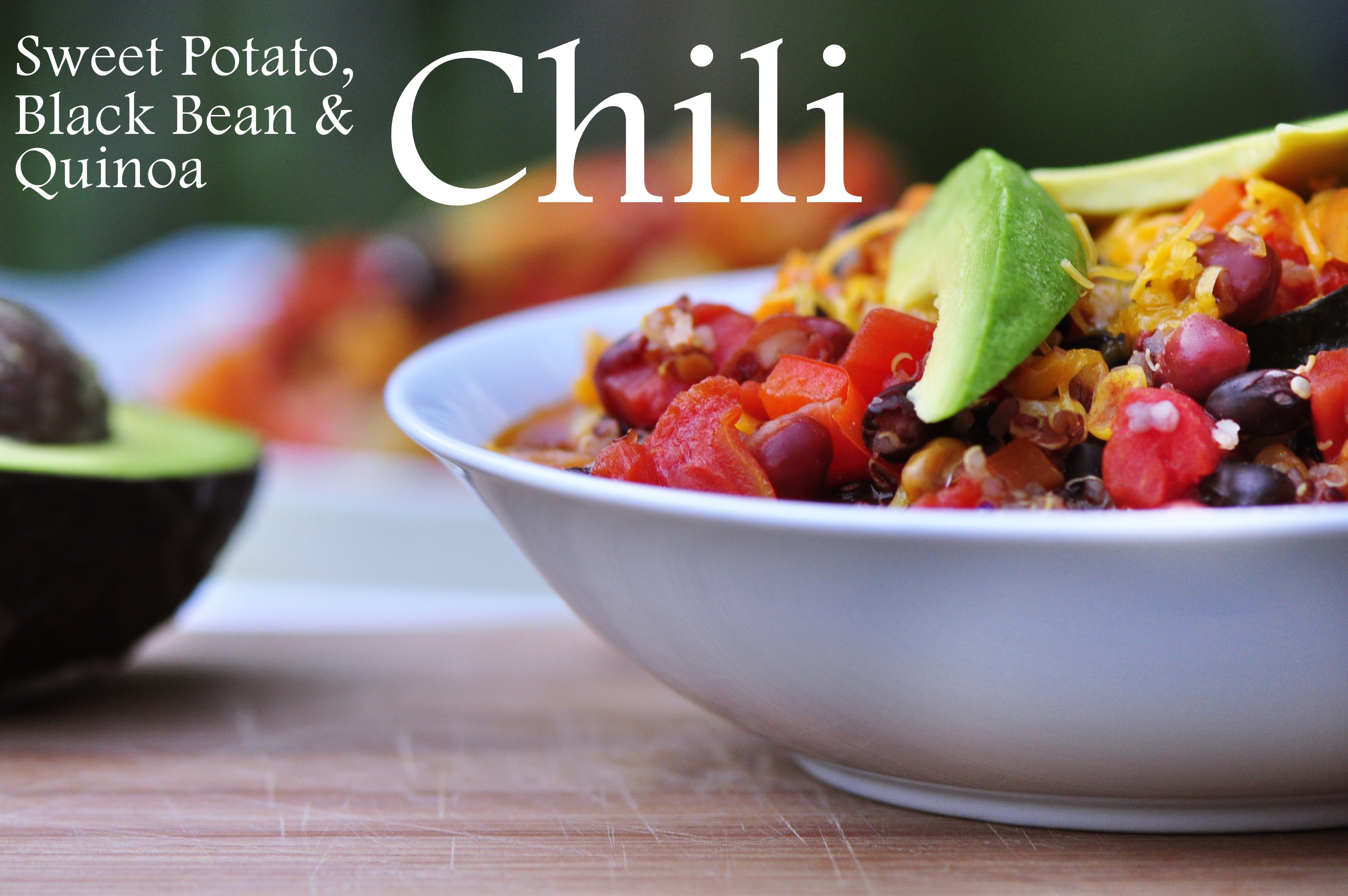 Serve hot with melted cheese on top, fresh chives and avocado slices.Sweet Potato, Black Bean and Quinoa ChiliSweet Potato, Black Bean and Quinoa Chili