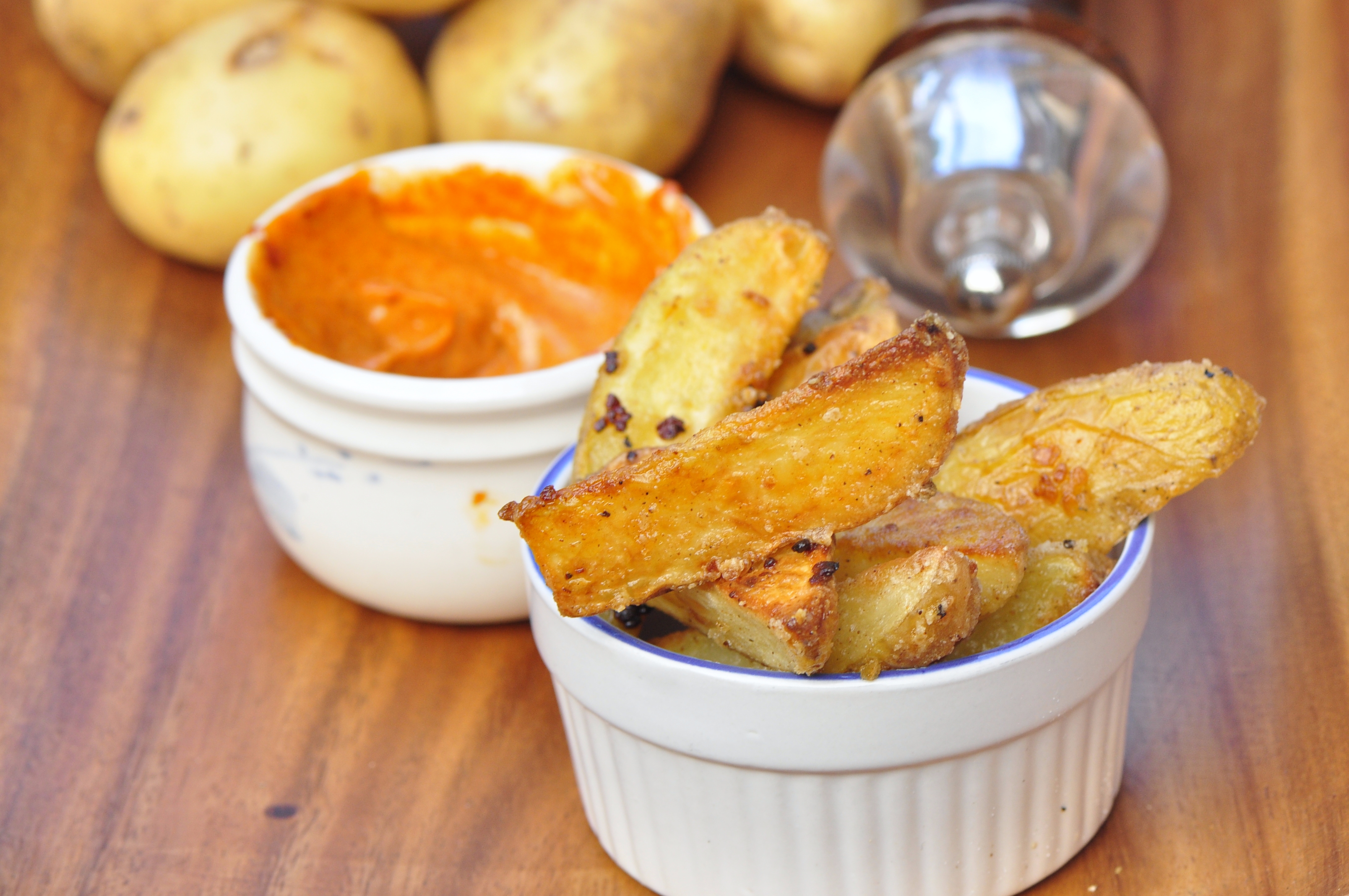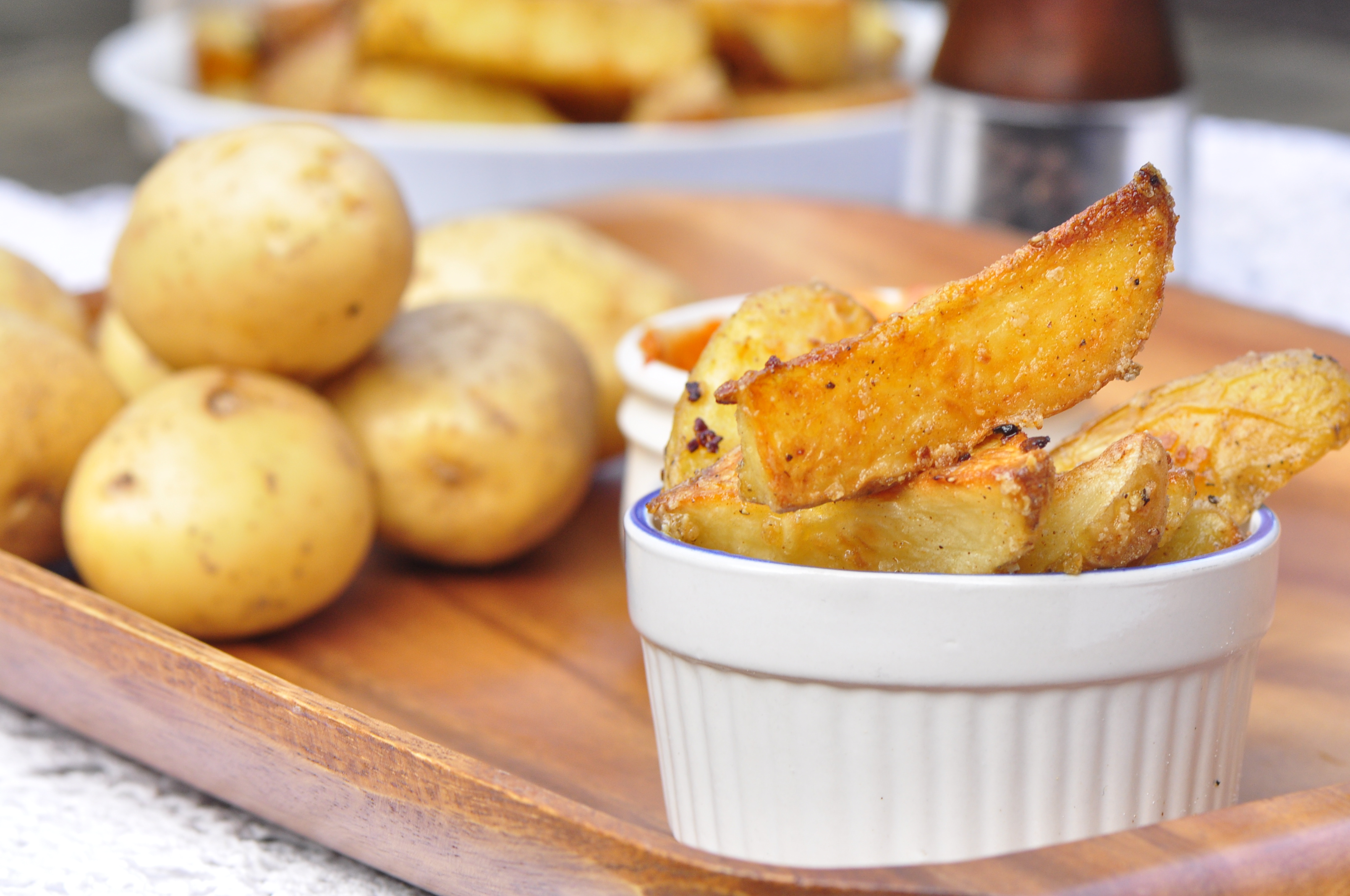 Potatoes, cut into wedges, soaked in garlic oil, sprinkled with spices and baked. Simple as that.