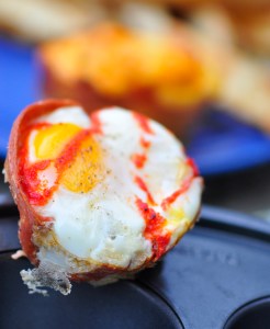 A vegetarian breakfast of baked eggs in muffin tins with a kick from Sriracha hot sauce.
