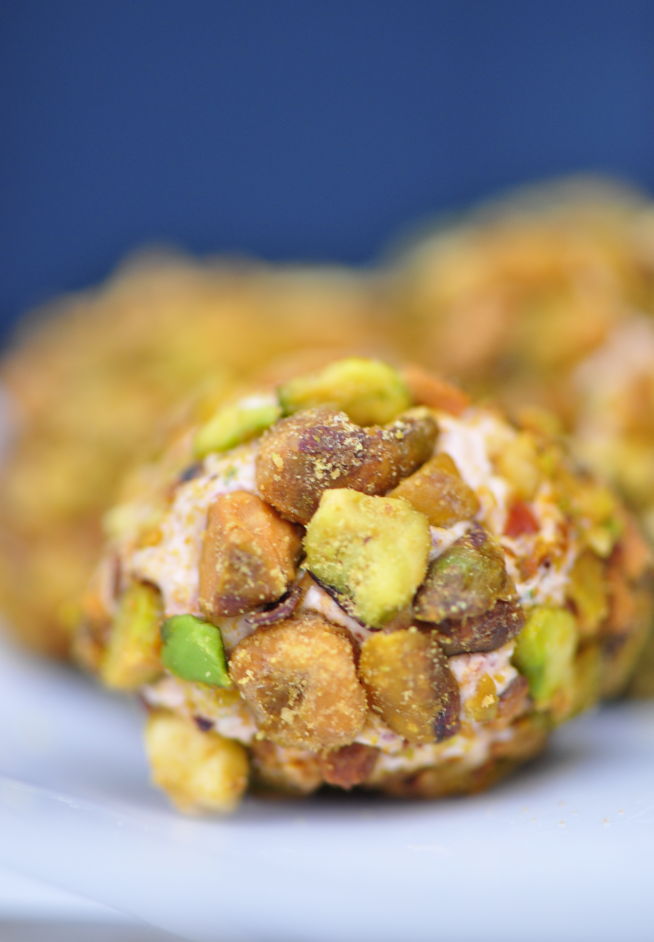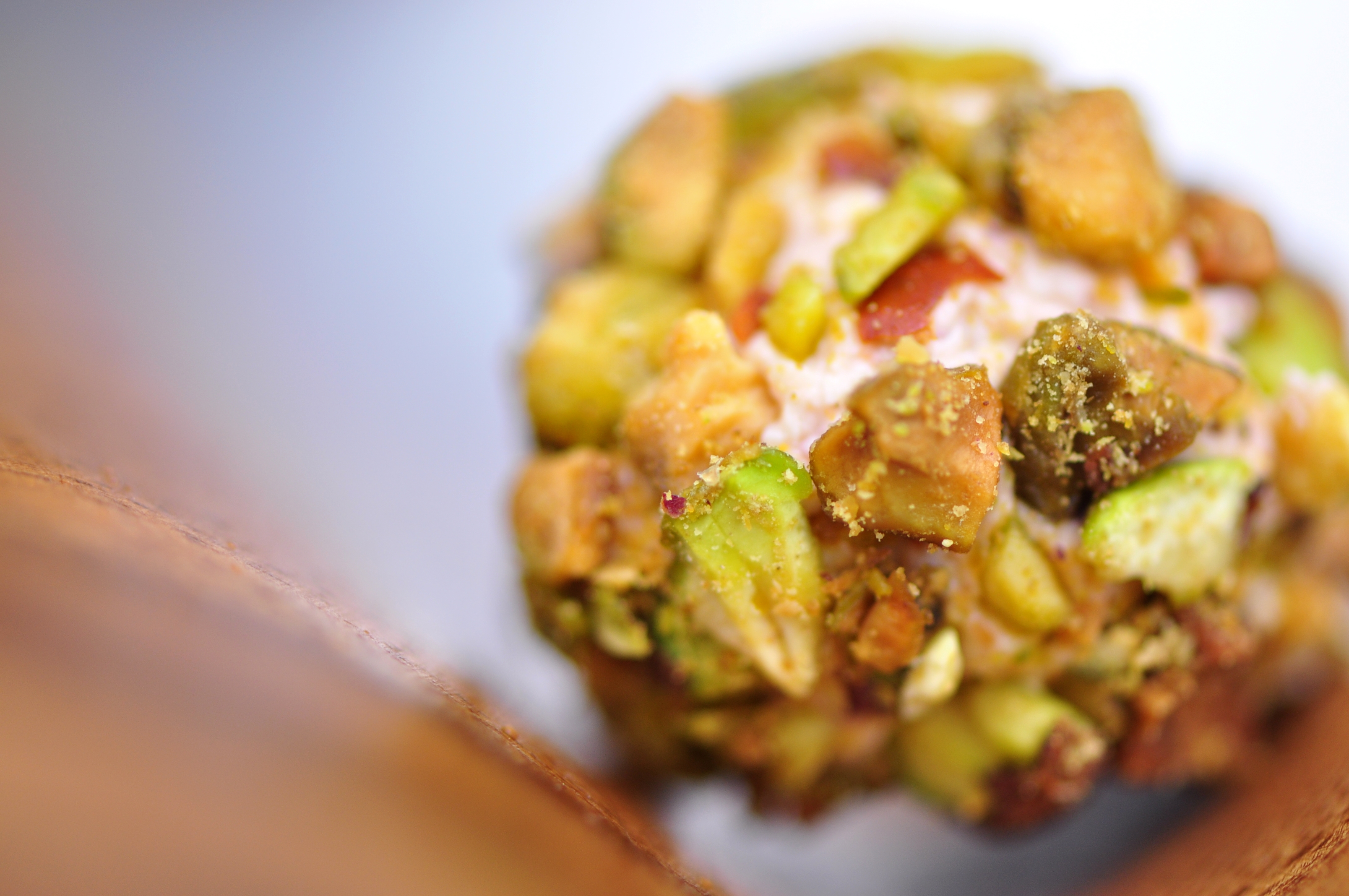 Transfer the mixture into a bowl, cover with plastic wrap and refrigerate for an hour. In the meantime, mix together the crushed pistachios and crushed red pepper in a bowl. Once the mixture has chilled, roll into coin-sized balls (roughly 3/4″). Roll each ball in the pistachio/red pepper mix, then either serve immediately or refrigerate until ready to serve. The truffles should be a room temperature when served, so if they have been in the fridge for a few hours, allow them about 30 minutes before eating. Served best with pita chips or other crunchy crackers.