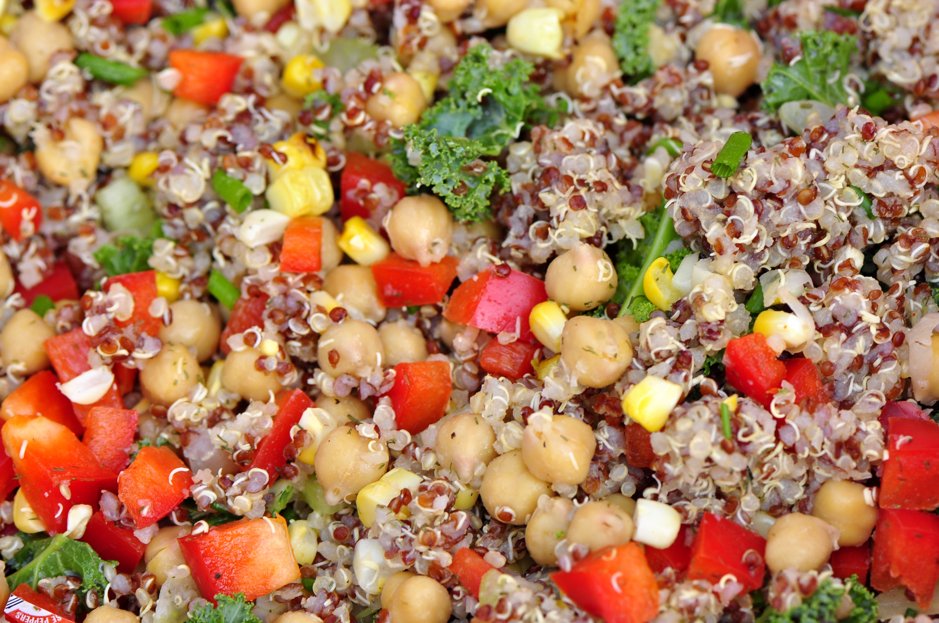 In a large bowl, mix chickpeas, bell pepper, kale, and grilled corn kernels (you can cut them off with a knife), celery, chives, black pepper and lemon juice. Toss quinoa into the bowl until all ingredients have mixed well together and serve hot or cold as a great summer sidedish.