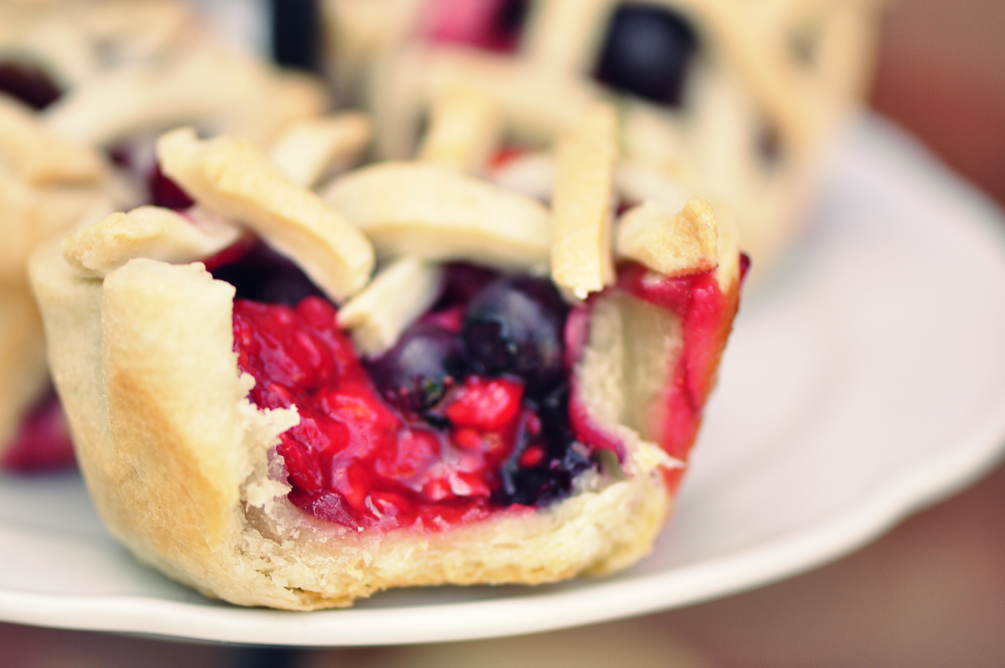 One mistake I made when making these was that I filled up my pies a little too much, so probably 90% of them overflowed or drowned the lattice a little bit. They still tasted great, but if you’re serving these up and want them looking cleaner, I’d stick to filling the cups about 3/4 of the way.Mini Mixed Berry PiesMini Mixed Berry Pies