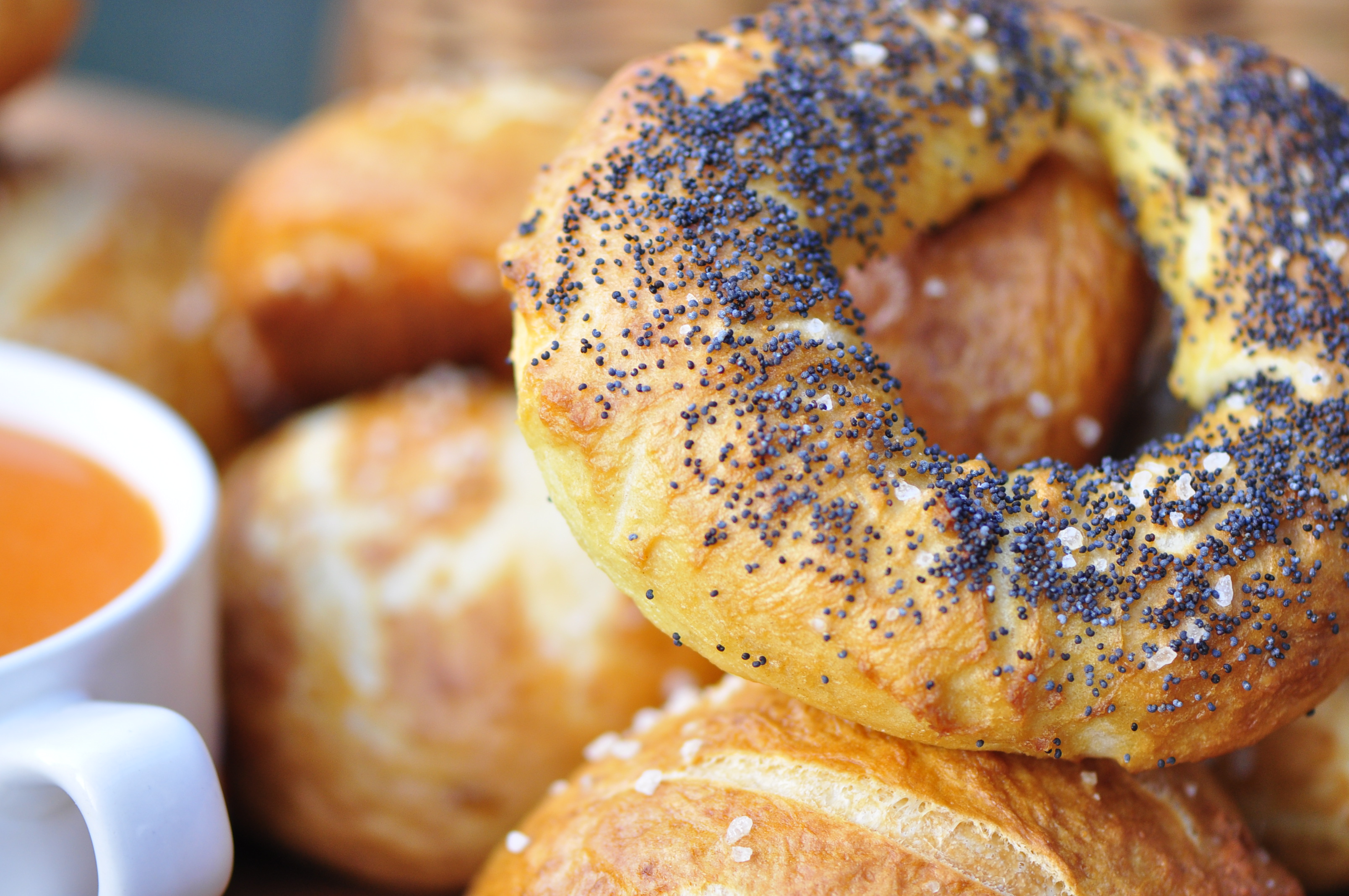 I decided to experiment with a small portion of the dough by making bagels and sandwich-length buns. I would recommend testing out the bagel shape the most because the consistency was ideal for dipping in soups and toasting, while the process was no more difficult than the rolls. Just sprinkle some poppy seeds on top along with the coarse salt and there you have it. Make a long, thin piece of dough, form a circle and pinch to two connecting ends. Boil as you would the other rolls and bake for the same amount of time as well.
