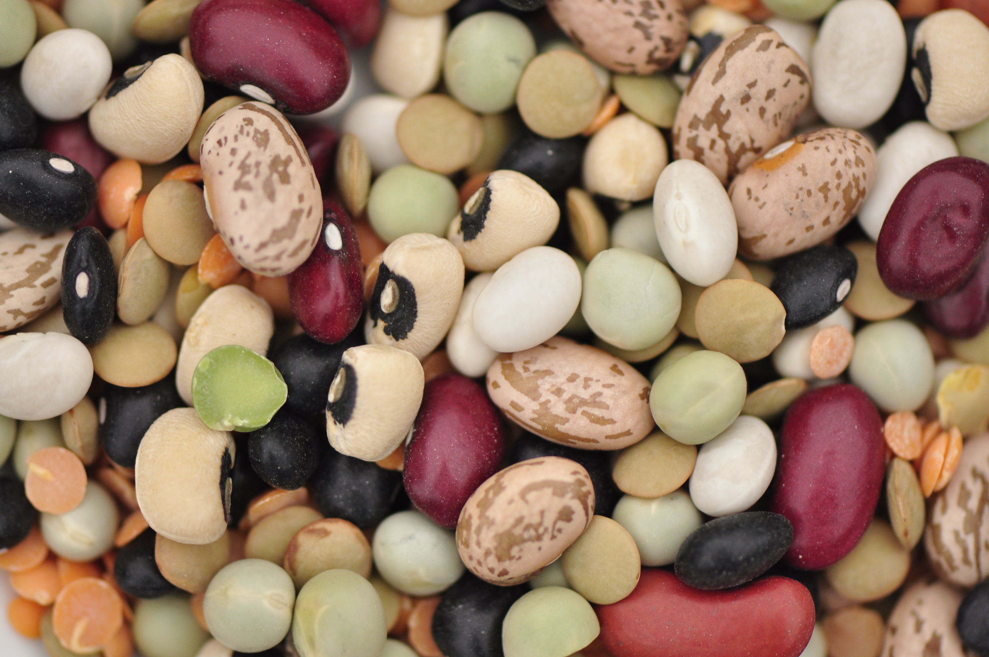 A mix of dried beans including pinto, kidney, split pea, lentil and more.