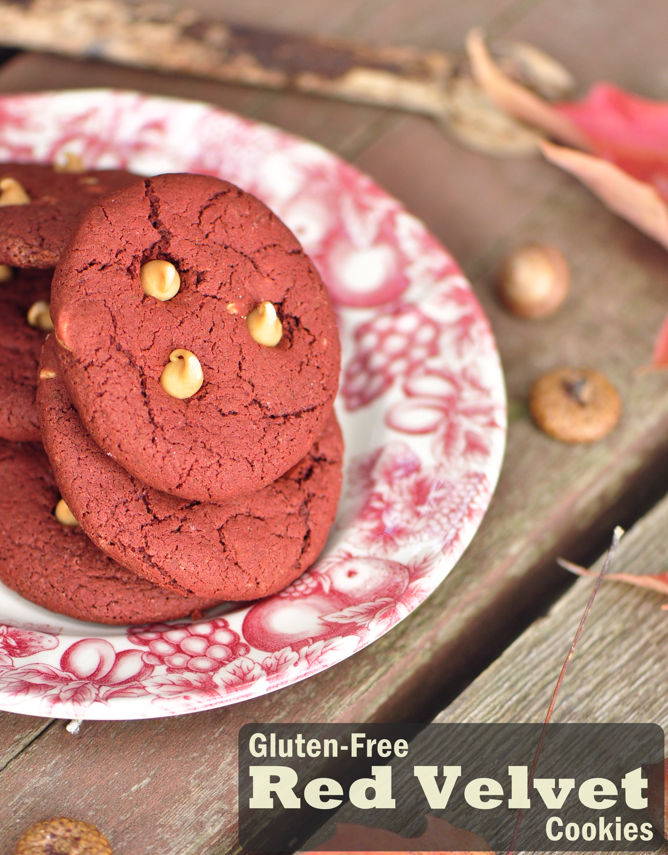 Red velvet cookies made with a gluten-free flour mix and peanut butter chips.