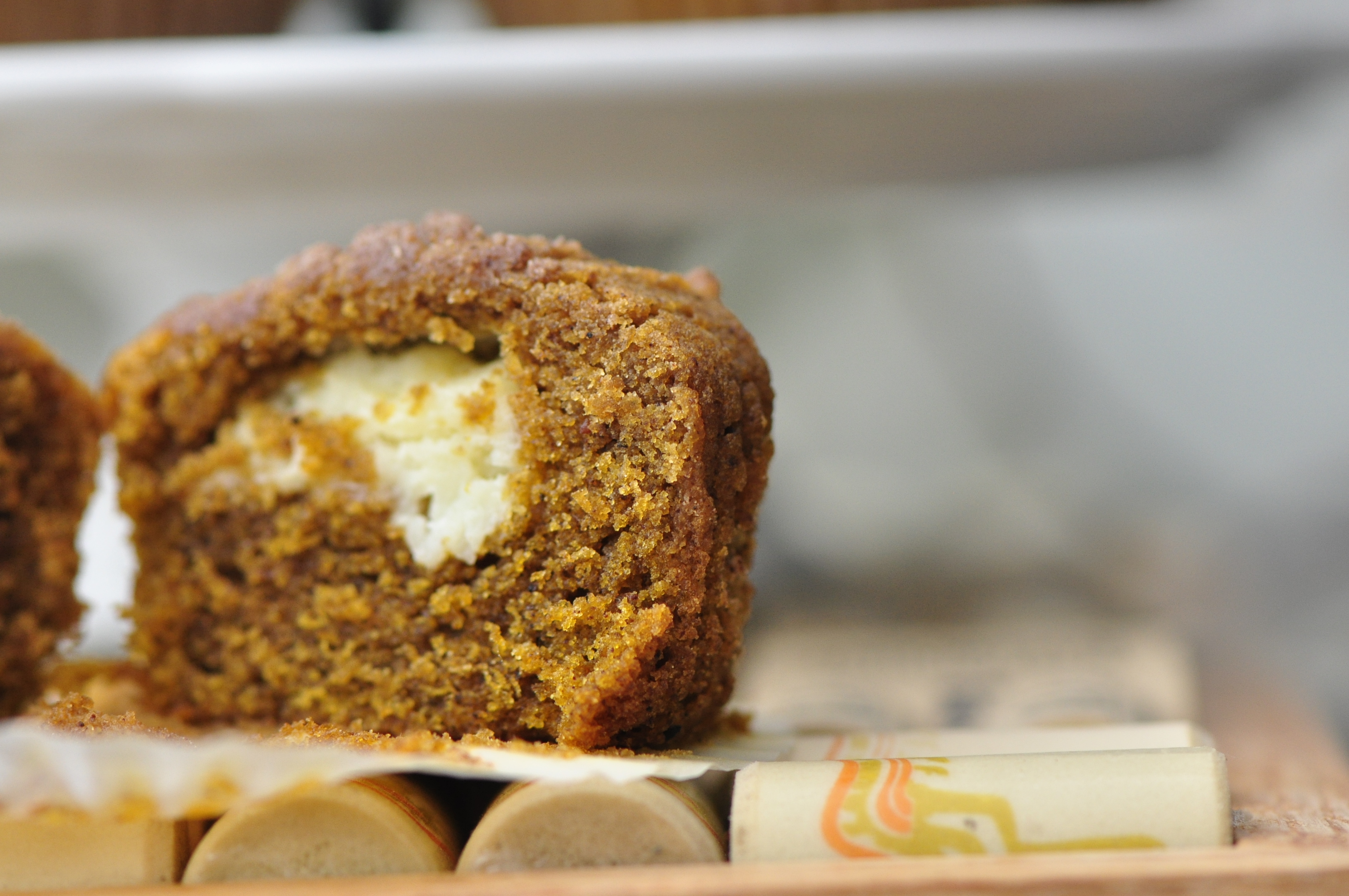 Sweet and simple pumpkin muffins with a cream cheese centre.
