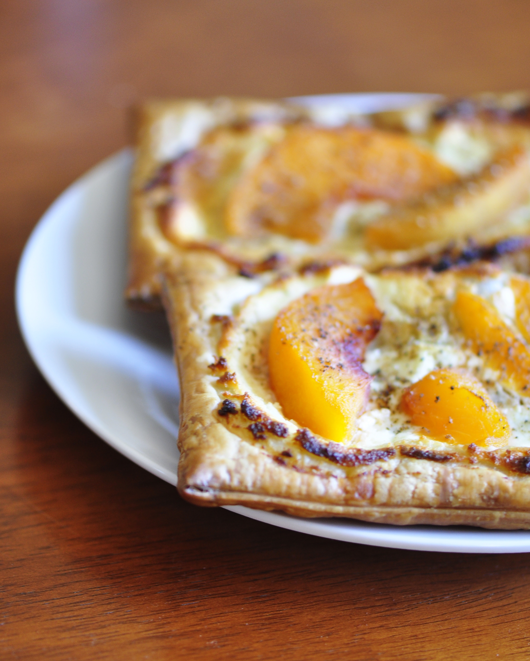 Puff pastry covered in goat cheese, topped with peppered fruit and a touch of honey.