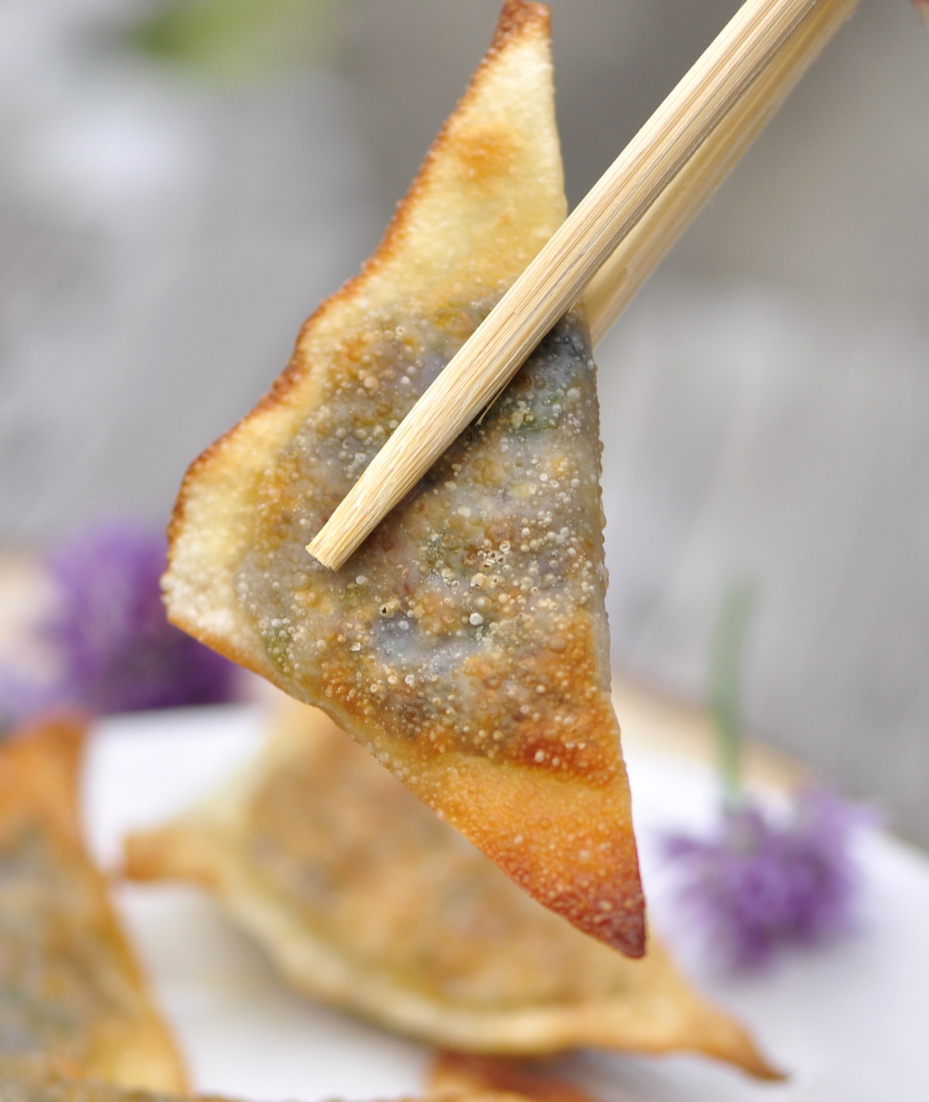 Pan fried chive flower dumplings with vegan filling.