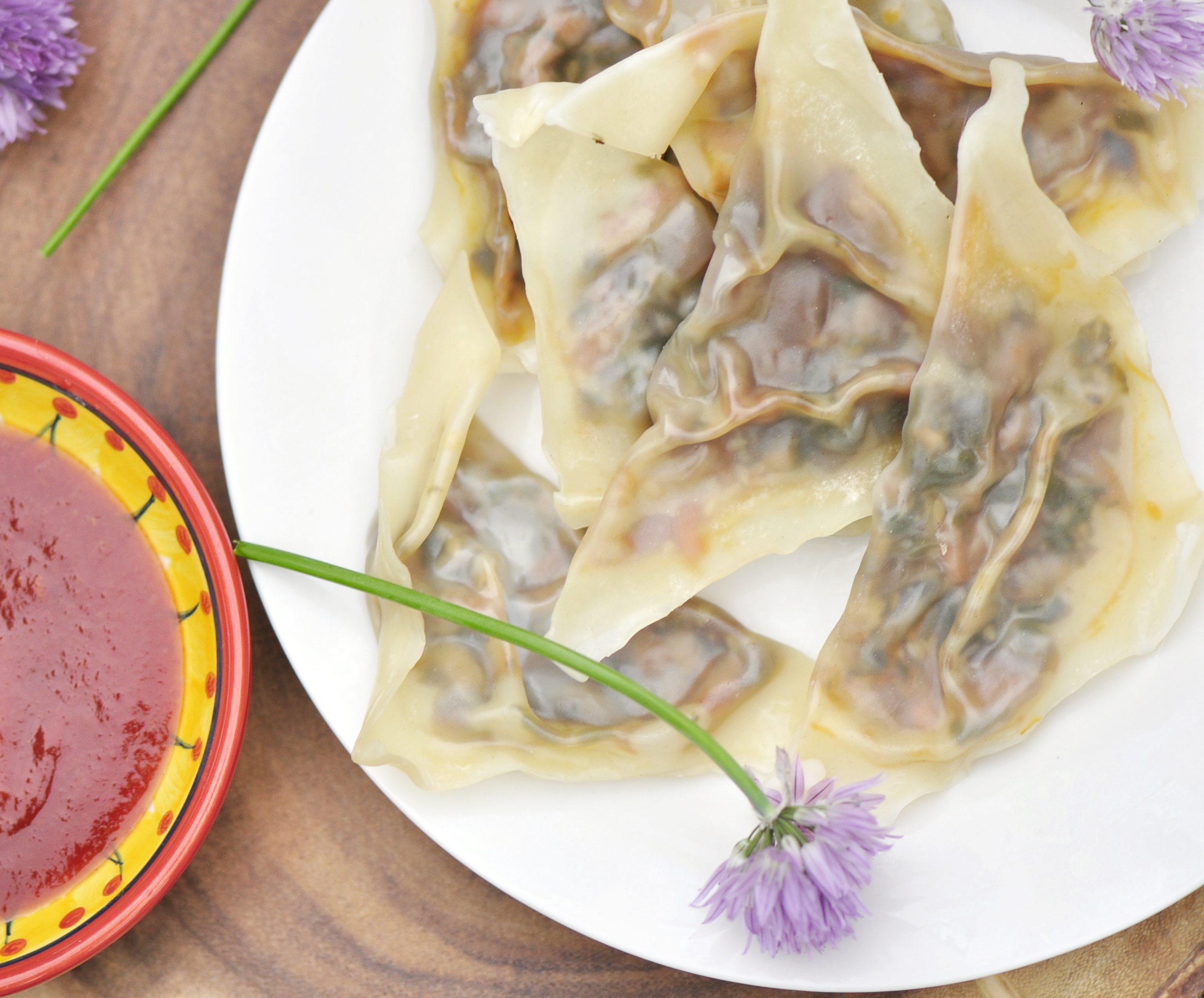 Steamed chive flower dumplings with a vegan filling.