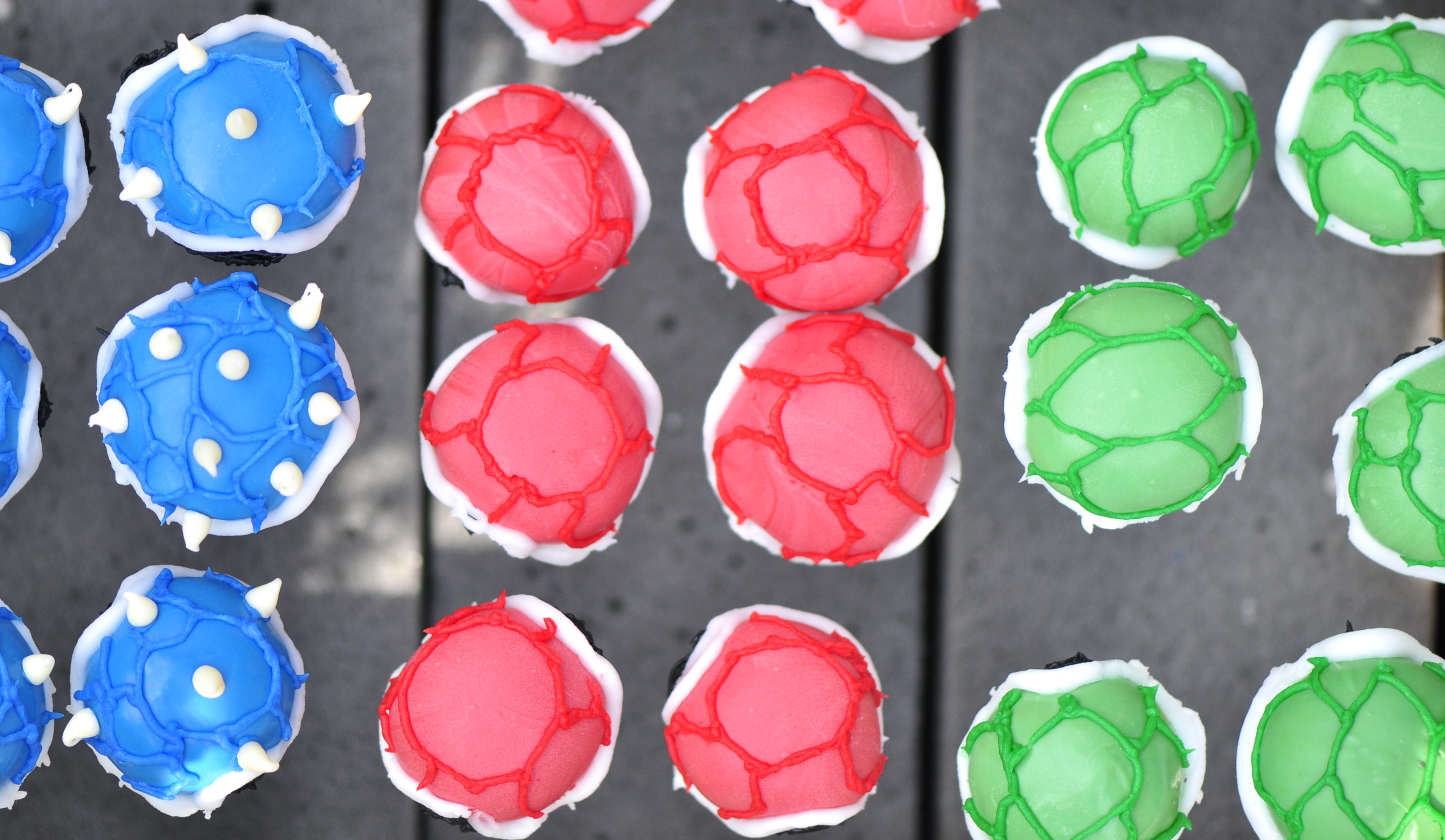 Mario Kart cake pops in the shape of Koopa shells in red, green and blue.