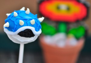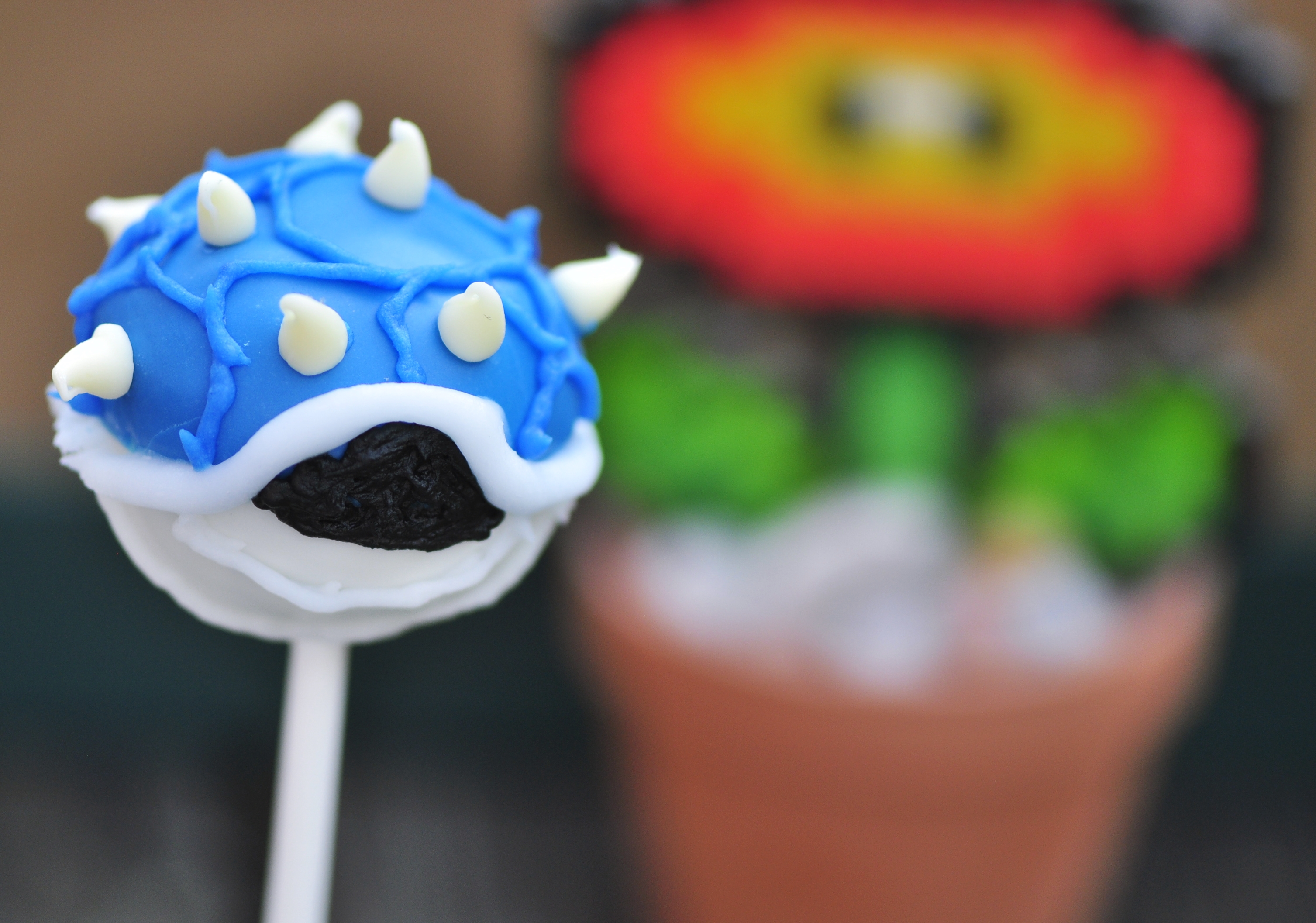 Mario Kart cake pops in the shape of Koopa shells in red, green and blue.