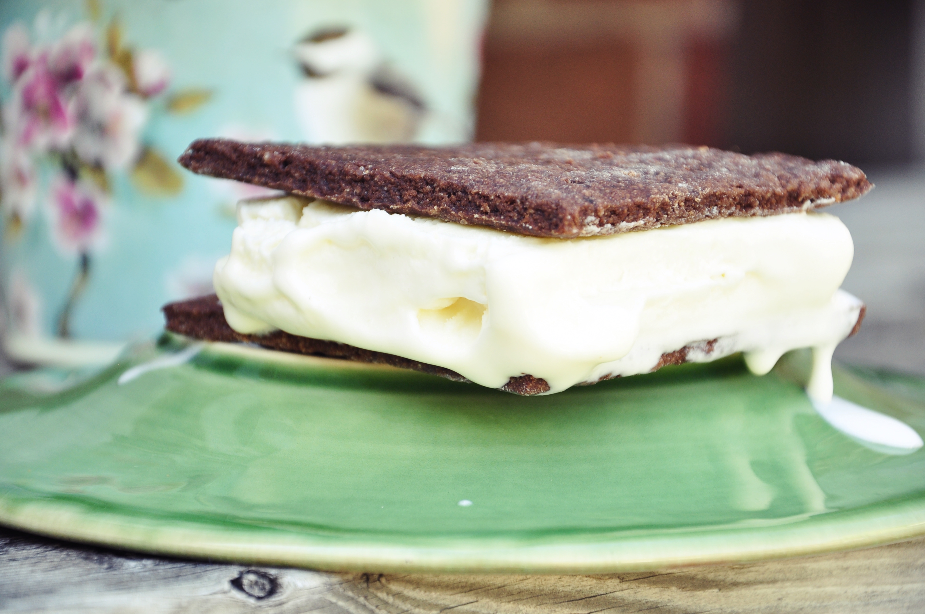 Ice Cream Sandwiches made with homemade chocolate cookies and a soft vanilla filling.