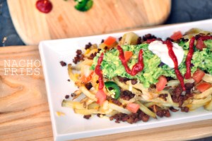 Nacho Fries: French fries smothered in guacamole, vegetarian ground beef, sour cream, tomatoes, jalapeno (a.k.a. the works). Only on The Vegetarian Ginger.