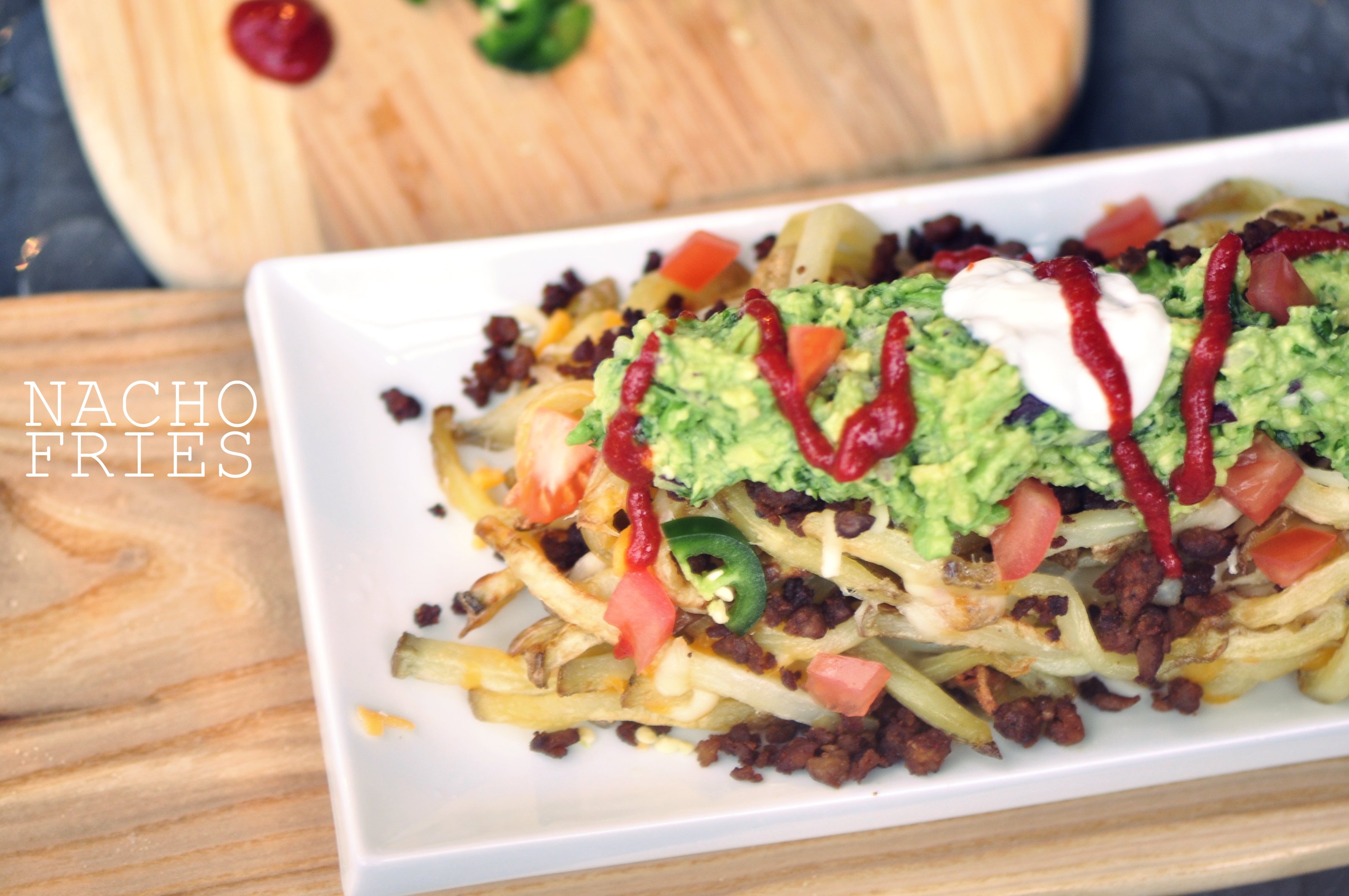 Nacho Fries: French fries smothered in guacamole, vegetarian ground beef, sour cream, tomatoes, jalapeno (a.k.a. the works). Only on The Vegetarian Ginger.